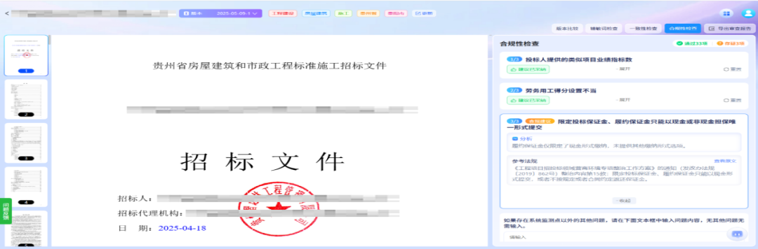 国家系统部署,场景落地“有章可循” 推动人工智能在招标投标领域应用是一项系统工程。《实施意见》明确,要按照政府引导、多方参与、场景牵引、安全可控的原则,积极稳妥推进人工智能在招标投标领域的应用。这是招标投标领域开创性的改革,将加快实现招标投标范式的重塑。 《实施意见》将“人工智能+”融入招标投标交易全过程,从招标发起开始,到投标、开标、评标、定标等,明确了具体的工作内容和要求。比如,规范招标文件编制和检测,提升文件编制质量;规范投标行为,提高投标的针对性和效率;规范开标和评标流程,增强竞标环节的公正和公平性;规范定标核验,确保定标决策科学合理、中标合同合法合规。 《实施意见》将“人工智能+”运用到招标投标管理重点环节,对现场管理和过程监管提出具体规范要求。比如,强调对交易场所的智能化管理调度、构建“智能研判—动态干预—链上存证”的闭环见证体系和档案智能化管理体系、搭建智慧问答引擎,以全面提升现场管理效能;构建评标专家全生命周期智能管理体系、“主体+行为”全覆盖的综合预警体系,打造招标投标智慧信用评价模型、贯通项目标前标中标后的分析预警模型,提高招标投标智能化投诉处理能力,以实现监管全覆盖、效率大提升。 《实施意见》以制度创新与数智赋能为核心抓手,系统推进主体责任落实、监管效能提升和交易环境优化,不仅有力保障了交易的公平公正,更在深层次上促进了阳光交易,为保障公共资源公平高效配置、规范招标投标市场秩序提供有力支撑,必将加快形成一个高效规范、公平竞争、充分开放的全国统一招标投标市场,更好助力全国统一大市场建设。 贵州省先行先试,探索创新初见成效 贵州省依托“全省一张网”平台,聚焦工程建设领域,率先构建涵盖招标文件合规检测、智能辅助评标等核心场景的人工智能应用体系,着力打造AI赋能三大核心应用,在交易效率、监管效能等方面取得系统性提升。 (一)AI合规检测:从“抽样查”到“全量查”。针对招标文件中可能存在的“量身定制”、设置隐性壁垒、排斥潜在投标人等问题,构建自主可控的招标文件合规检测大模型。系统梳理法规政策860份,形成结构化规则知识库,并基于3287个历史项目开展多轮训练调优。将模型全面融入全省统一电子监管平台,实现“全量自动检测—监督核实—整改反馈”闭环管理,监管模式由传统20%“抽样查”转为100%“全量查”。截至2025年底,模型设置110个合规检查点,累计检测工程建设项目9096宗,发现合规性疑点1.63万个。 招标文件合规检测界面 贵州省公共资源交易中心供图 (二)AI智能辅助评标:人机协同提升评审质效。针对工程建设项目“评标效率低、技术评审主观性强、涉及专业规则多”等痛点,以房屋建筑施工项目为突破口,构建和训练专业化多模态评审模型,系统梳理客观项44个、主观项256个评审点,完成2.7亿Tokens建筑领域知识预训练等,并开展多轮模拟论证。截至2026年1月,已实现86个房建、市政项目AI辅助评审。 技术标主观分辅助评审界面 贵州省公共资源交易中心供图 (三)AI辅助监管:推动监管模式从大数据分析向AI精准识别升级。为破解围串标行为隐蔽性强、传统手段难以发现的难题,建立交易主体关系智能监管模型,可快速识别四类主体七类异常关联情形,精准发现异常行为模式。在贵州省公共资源交易监管平台设立29个预警监测点,纵向贯通1222个监管部门,横向汇聚发改、财政、住建等部门数据,形成覆盖交易全链条的智能监管网络,实现风险实时感知与闭环处置。截至2026年1月,依托模型预警线索,纪检监察机关已依法查处128人,监管穿透力与响应速度得到显著提升。 对标国家部署,深化场景推广应用 2026年,贵州省将深入贯彻《实施意见》部署要求,持续加强人工智能在招标投标领域应用的深度广度,着力打造“智能、高效、公平、廉洁”公共资源交易新生态,为全国提供可复制、可推广的实践样本。 一是根据实践需求和技术基础,科学确定实施路径,分类推进市场化场景和政府主导场景应用,并指导市县按要求开展部署应用。 二是持续深化公共资源交易平台整合共享,强化有关平台系统互联互通,提高模型部署应用效率,逐步向水利、交通等行业延伸推行AI辅助评标,扩大AI应用领域。 三是加强招标投标数据治理,建立人工智能模型常态化升级机制,及时更新数据集和知识库,推动智能辅助评审模型从“合格判定”向“评估评优”升级。 四是健全应用机制,加强人工智能应用与招标投标全流程各环节的衔接,强化模型算法、数据资源、基础设施、应用系统等安全能力建设,会同行业主管部门持续完善配套政策,探索建立人工智能应用规范与评价标准,夯实应用法治化、规范化基础。